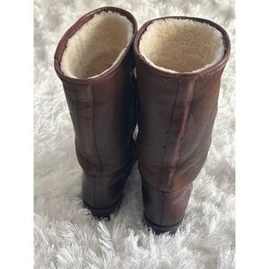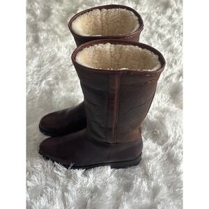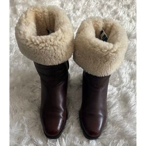 Excellent used condition. Brown leather tall winter boots with cozy shearling lining. These boots feature a durable rubber sole with a deep tread for excellent traction. The classic design offers both warmth and style for cooler weather.