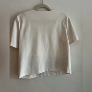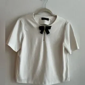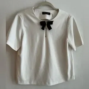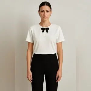 White , short-sleeved blouse with a black bow and a visible zipper detail.