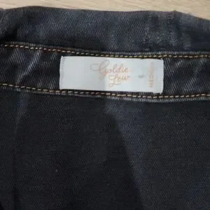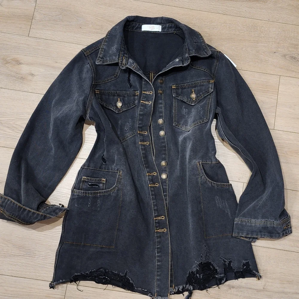 Elevate your style with this chic black denim jacket. Featuring a distressed hem and classic button closure, it's perfect for a trendy, casual look.