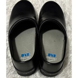 EXCELLENT CONDITION. Dansko Professional clogs in rich black leather. These slip-on shoes offer a comfortable and supportive fit, perfect for all-day wear. Features a rounded toe and a sturdy sole for excellent durability. The footbed is contoured for ergonomic support, and the heel provides a slight lift.