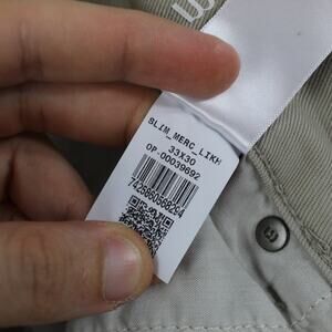 Tag information: Inner care label lists 98% cotton and 2% elastane; made in Honduras and finished in New York; style code SLIM_MERC_LKM; size 33x30; OP-00039692; EAN: 7425860568294.