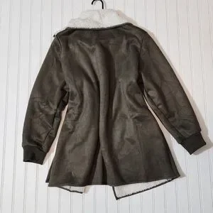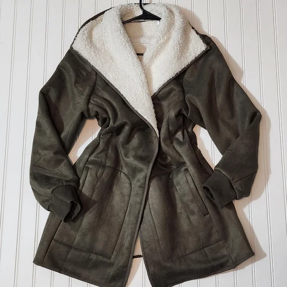 Embrace warmth and style with this olive teddy jacket featuring a plush sherpa lining. Ideal for cool weather.