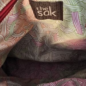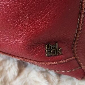 Elegant cherry red shoulder bag by The Sak. Features a front zipper pocket and adjustable strap.