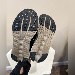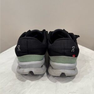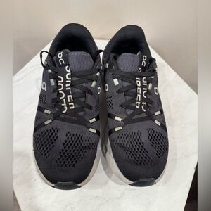Sleek black sneakers by On Running. Features a breathable mesh upper and cushioned sole. Used in good condition