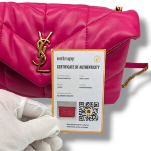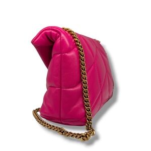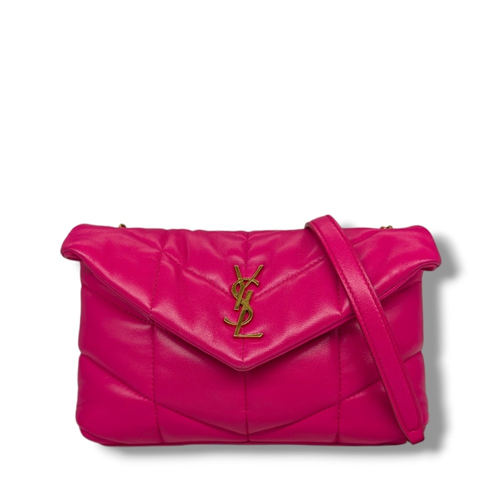 Make a bold statement with this Saint Laurent Toy Loulou Puffer Satchel, crafted in luxurious hot pink lambskin leather. The plush quilted design gives it a chic, modern edge, perfectly balanced with the elegance of the iconic YSL logo in gold-tone hardware. This compact yet practical satchel features a magnetic flap closure and a versatile leather strap for shoulder or crossbody wear. The soft lambskin leather makes it lightweight and comfortable to carry while maintaining a structured silhouette. Perfect for day-to-night styling, this bag is a standout piece that embodies Saint Laurent’s Parisian glamour.
