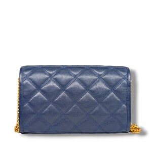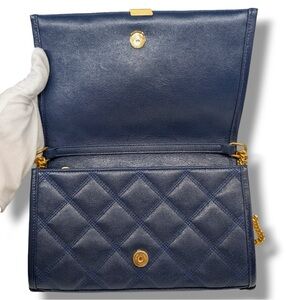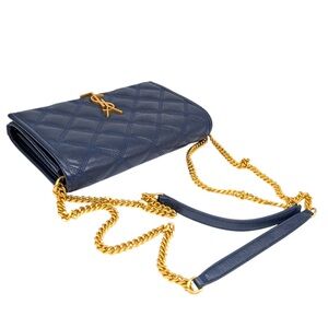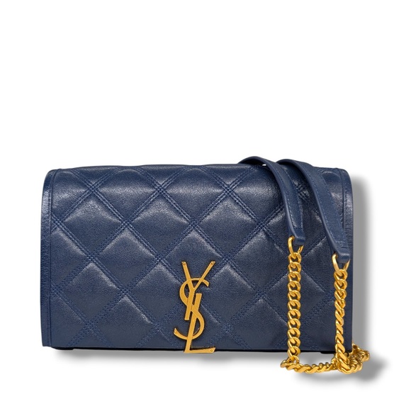 This Saint Laurent Mini Becky Chain Bag is crafted from smooth quilted lambskin leather, finished in a rich blue tone with the iconic gold-tone YSL monogram at the front. The structured silhouette is complemented by a sleek flap closure and a sliding chain strap, allowing it to be worn comfortably on the shoulder or crossbody. The interior is lined in matching leather and features multiple built-in card slots along with a secure zip pocket, making it both elegant and functional. Compact yet thoughtfully designed, this piece is perfect for carrying your daily essentials while maintaining a polished, elevated look. A timeless Saint Laurent style that transitions effortlessly from day to night.