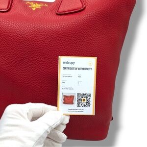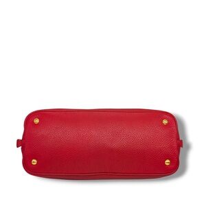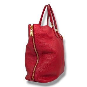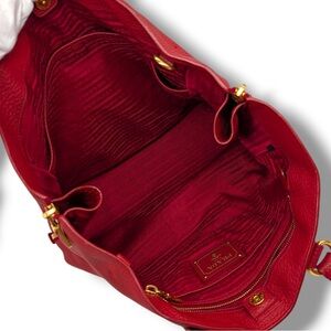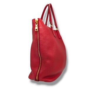 This Prada Vitello Daino Side Zip Shopper Tote is crafted from supple Vitello Daino pebbled calfskin leather in a rich red hue, finished with gold-tone hardware and the iconic Prada logo at the front. Designed in the large size, it features rolled leather top handles along with an optional adjustable shoulder strap for comfortable shoulder or hand carry. The signature side zip gussets allow the bag to expand in width, offering added capacity while preserving its elegant silhouette. The interior is fully lined in Prada logo jacquard fabric and includes a spacious main compartment with a zip pocket and slip pocket for organized storage. Made in Italy, this tote blends timeless design with everyday functionality.