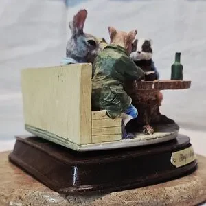 This highly detailed piece features four anthropomorphic friends—a mouse, rabbit, frog, and badger—enjoying a round of dominoes and drinks at a rustic tree-stump table. Perfect for collectors of animal miniatures, Beatrix Potter-style decor, or those who love the "cottagecore" aesthetic.