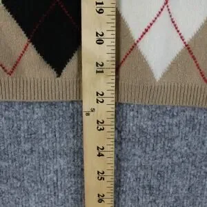 Details: Soft fine-gauge knit cashmere construction, front argyle diamond intarsia with contrast red overcheck, back wide horizontal camel and white stripes, ribbed foldover turtleneck collar, ribbed cuffs and hem, tonal seaming at shoulders, small red embroidered Burberry equestrian knight logo at lower front, Burberry London woven neck label, interior care label with dry-clean-only instructions and fabric content, style code NDERB12V/C on inner tag.