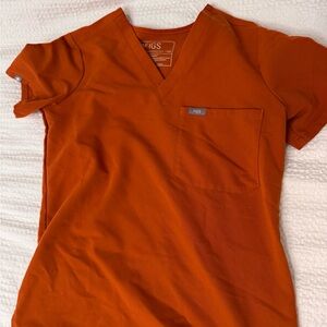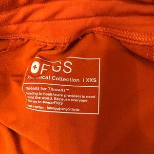 Stylish orange scrub set by Figs. Features a red drawstring accent. Comfortable and professional.