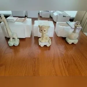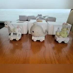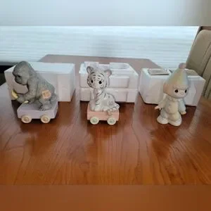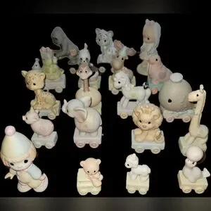The Precious Moments Train Set Complete 18 Piece Set 1-16 with Box features intricately designed porcelain figurines depicting a clown and a day in heaven. This multicolor set, manufactured in 1985, showcases a train theme with a matte finish. Perfect for all occasions, this American-style collectible set comes boxed, making it a delightful addition to any decor. Each figurine in the set is signed by the renowned brand, Precious Moments.