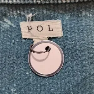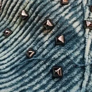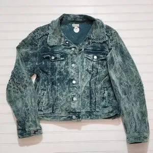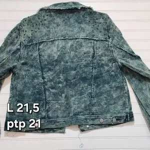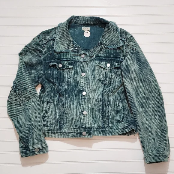 Trendy teal corduroy jacket with button closure. Features chest pockets and unique distressed design. Ideal for casual outings.