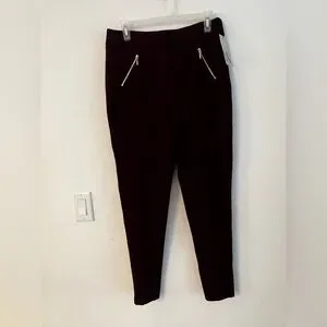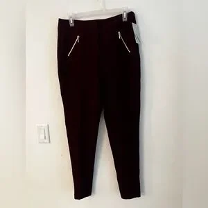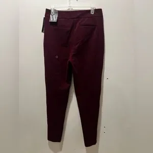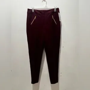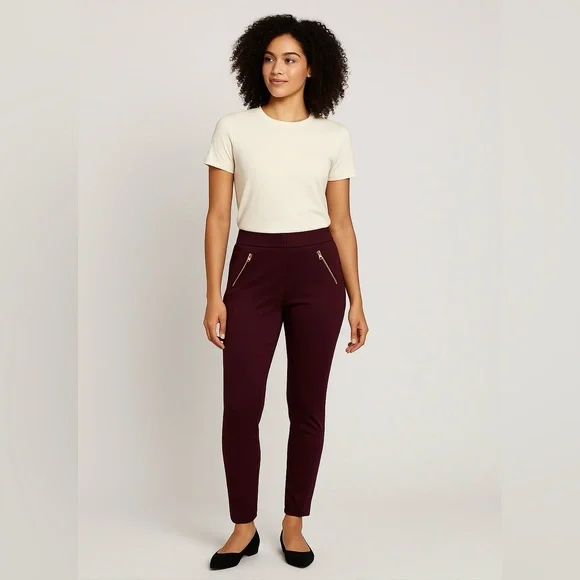 Worthington Ultra Stretch Ponte Skinny Pants are designed for both comfort and style. Crafted in a rich burgundy/wine color, they feature a flattering slim silhouette, front seam detailing, and gold-tone zippered pockets for a polished finish. Perfect for work, casual outings, or a night out.