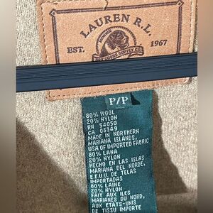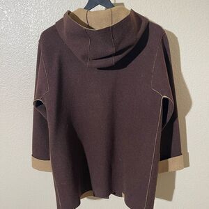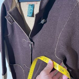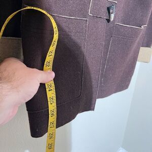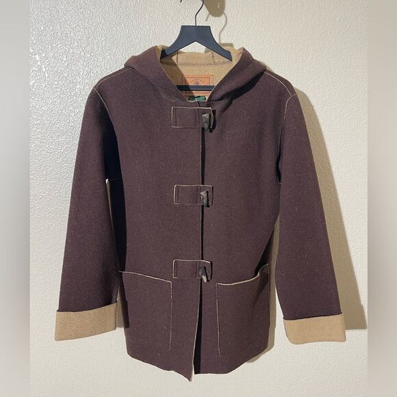 Elegant brown pea coat with tan accents. Features toggle closures and front pockets. Perfect for cool weather.