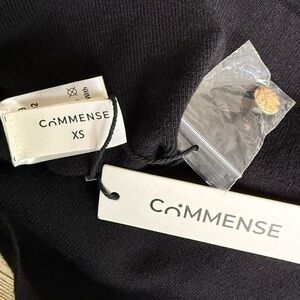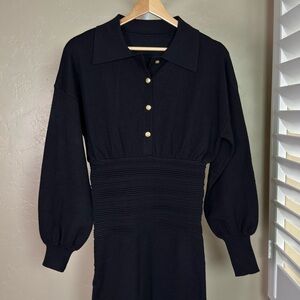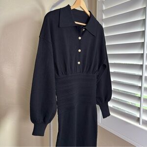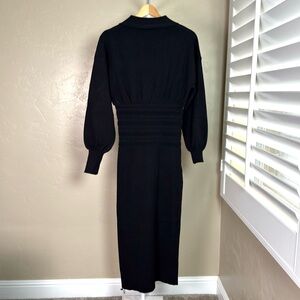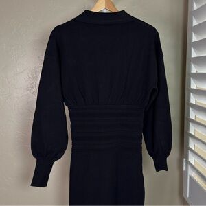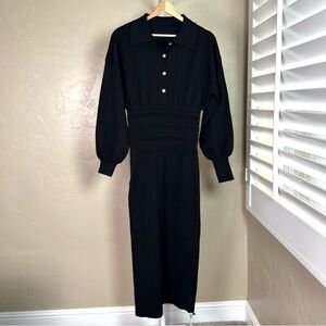 Commense Black Cinched Waist Knit Midi Dress Gold Buttons NWT XS
