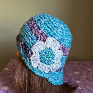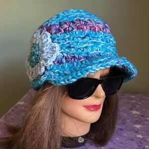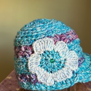 Add a touch of elegance to your look with this teal crochet newsboy baseball cap featuring a charming floral detail. Perfect for any occasion. Warmest winter medium double stringed for warmth baseball hat clean never worn new wash suggestion in tied pantyhose sock or cloth laundry bag to prevent piling fuzz and maintain form and beauty.