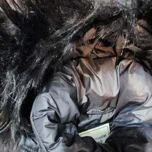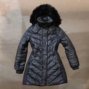 Elegant charcoal puffer coat. Features a warm, fur-lined hood. Ideal for winter wear. like new