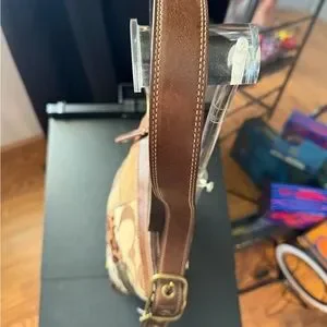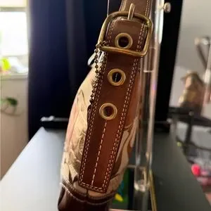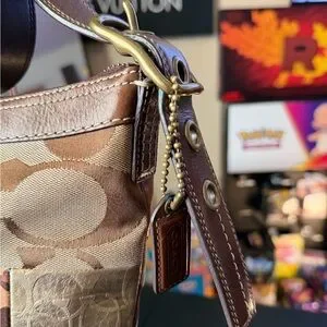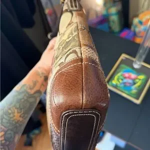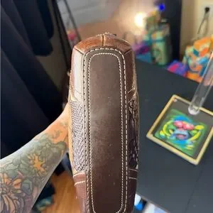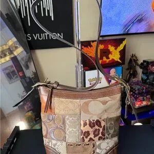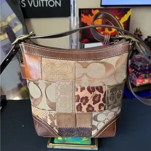 Stylish patchwork shoulder bag featuring a mix of brown tones. Perfect for adding a unique touch to any outfit. Hard to find. Great overall condition.