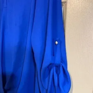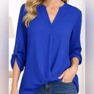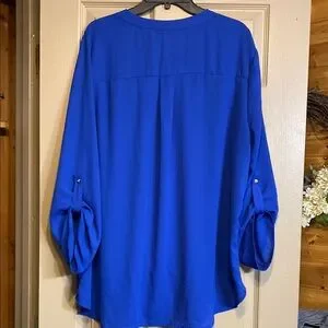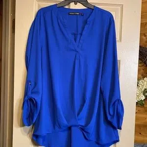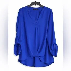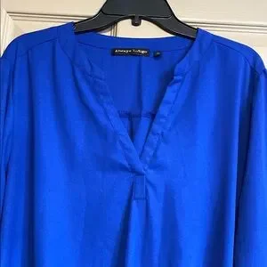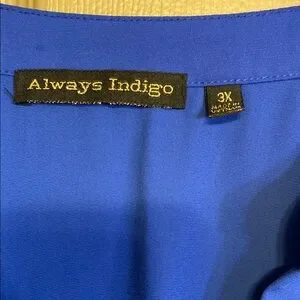 Discover the elegance of this blue blouse from Always Indigo, featuring a relaxed fit and an asymmetrical design. The 3/4 sleeves and mandarin collar add a touch of sophistication, making it perfect for both work and casual outings. Its soft, lightweight fabric ensures comfort throughout the day.Excellent Condition