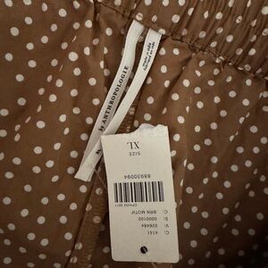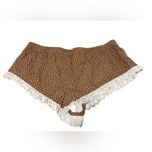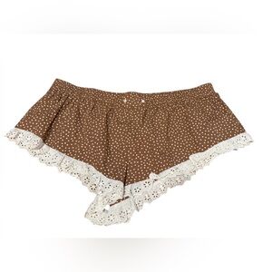 Charming sleep shorts with tan polka dots. Features delicate white lace trim. Ideal for cozy nights.