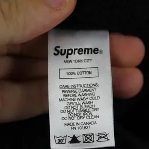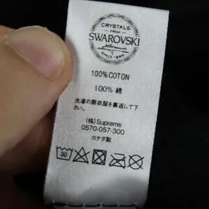 Brand details: Red woven Supreme main label; interior care label reading Supreme New York City 100% Cotton; additional Crystals from Swarovski collaboration tag; RN 101837 on care label; white SUPREME embroidery on rear patch pocket.