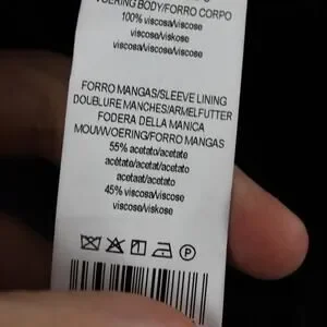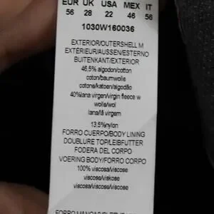 Materials (per care tag): Shell 46.5% cotton, 40% virgin wool, 13.5% nylon; body lining 100% viscose; sleeve lining 55% acetate and 45% viscose.