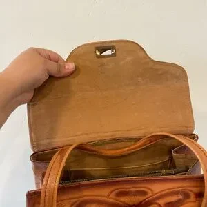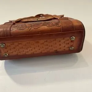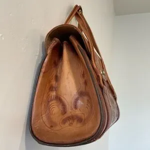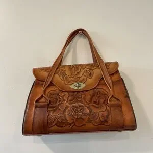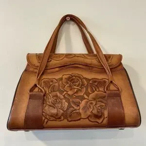 This vintage leather satchel features exquisite floral carvings, offering a unique blend of style and elegance. The rich brown hue complements any outfit, making it a versatile addition to your wardrobe.