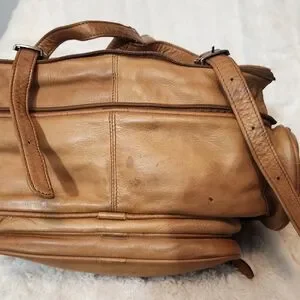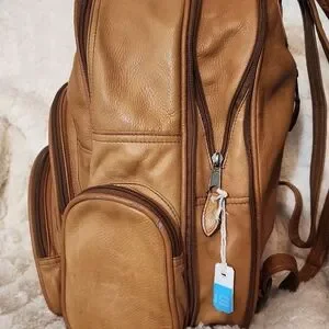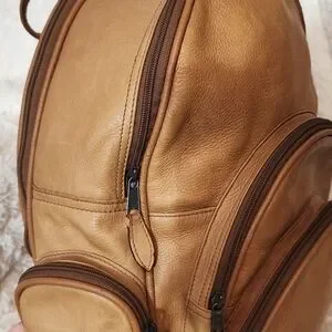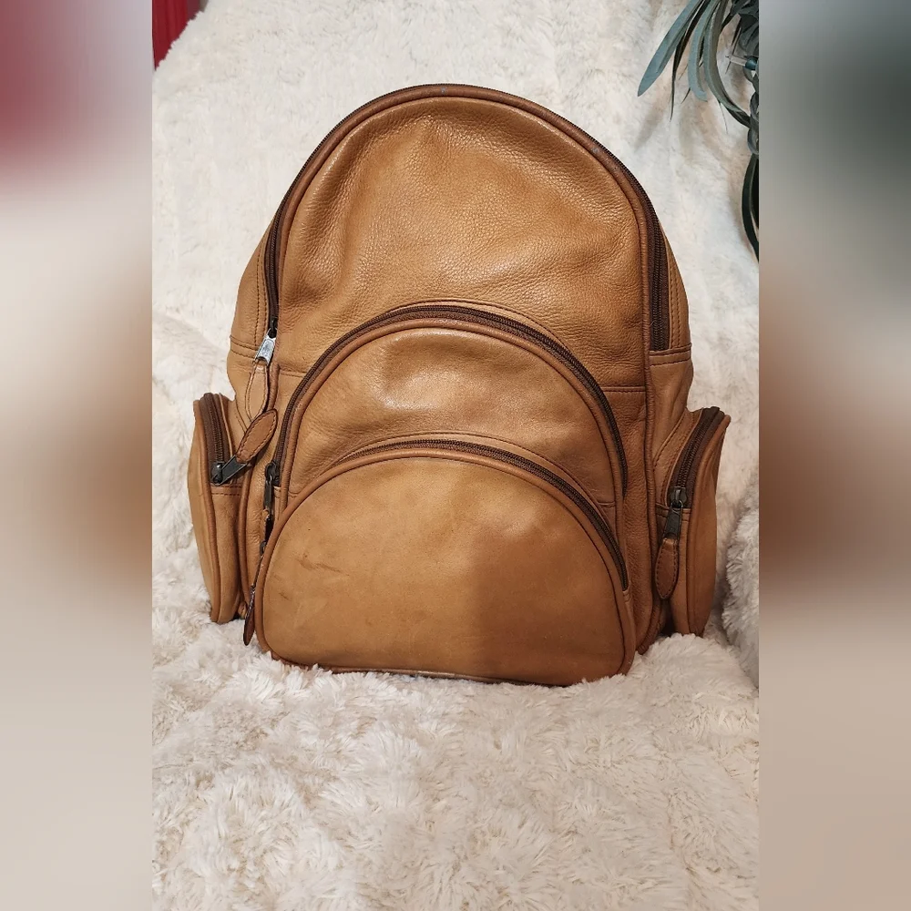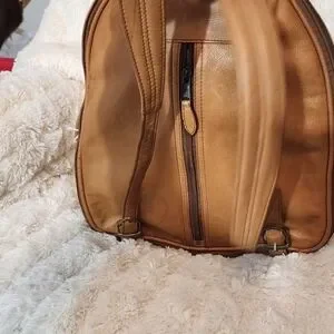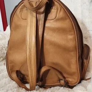 Discover the perfect blend of style and functionality with this tan leather backpack. Ideal for everyday use, it offers ample storage and a sleek design. clean inside. outside have some wet marks. no so bright.