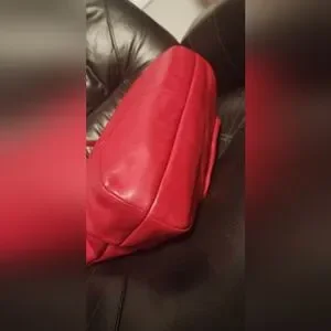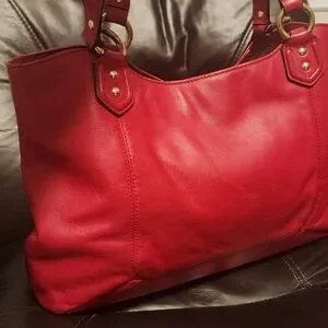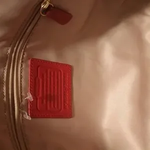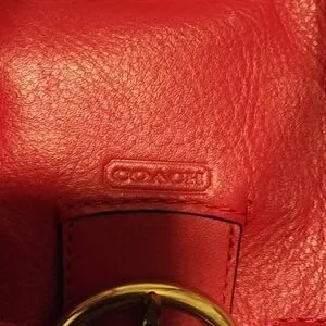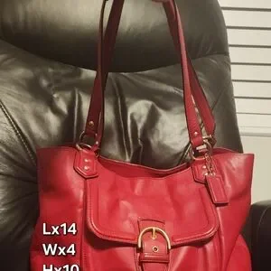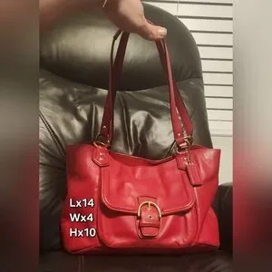 Elegant red leather bag with gold buckle. Dual handles for easy carrying. Perfect for any occasion.is a Coach Campbell Belle satchel in red leather.