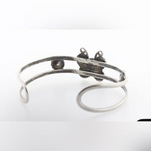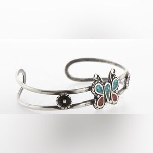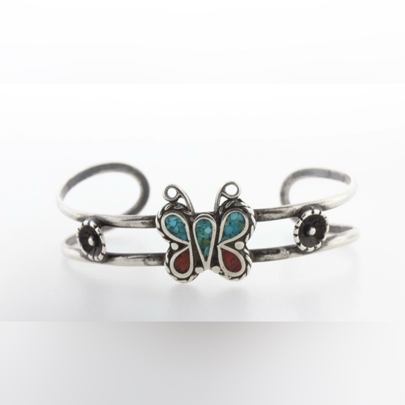 Native American Vtg Sterling Silver Butterfly Turquoise & Coral Inlay Cuff Bracelet