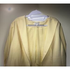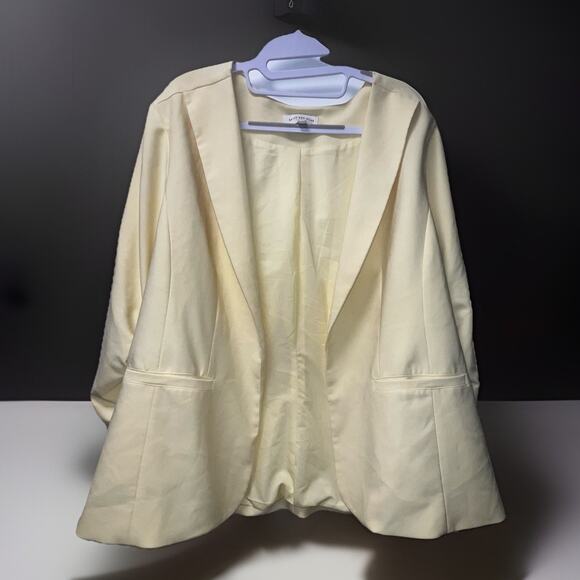 The SKIES ARE BLUE Curvy 2XL Blazer in Yellow is a stylish and versatile career jacket suitable for various occasions. Made from a blend of polyester and spandex, this 3/4 sleeve blazer features a solid pattern with a velvet fabric type, making it a chic option for the workplace or party. The single-breasted design and notch lapel add a touch of sophistication, while the polyester lining ensures comfort. Perfect for the fall, spring, and winter seasons, this blazer is a great addition to any woman's wardrobe.