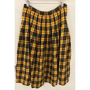 Vintage Pendleton wool midi skirt in a classic yellow black and red plaid pattern. Features a pleated design for a timeless silhouette and a comfortable fit. A versatile piece crafted from high-quality wool for warmth and durability. No size most likely a 10.