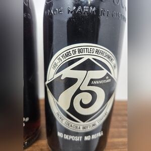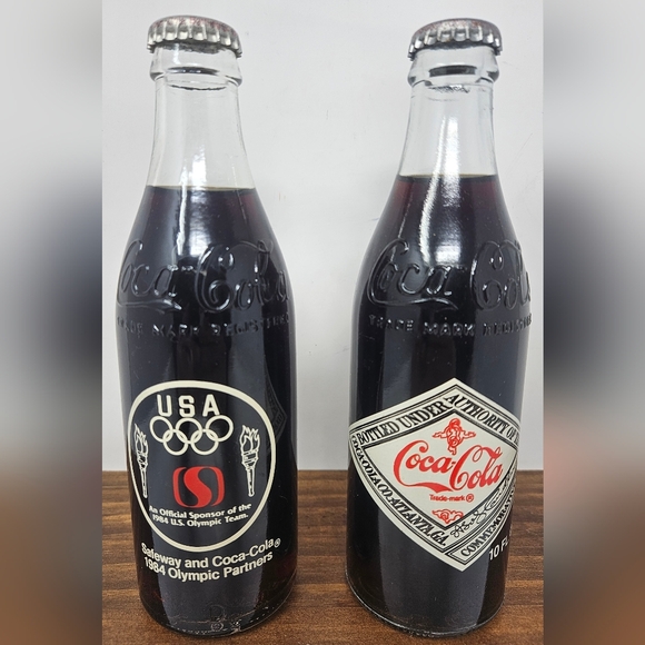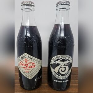 Here we have 2 unopened Coca-Cola bottles, one from the 1984 Los Angeles Olympics 10 Oz. and one 75th anniversary commemorative bottle unopened.  Both in good shape.