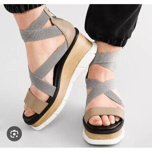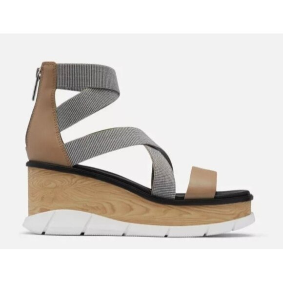 sorel wedge sandals, women platform sandals, criss cross strap sandals, zip back sandals, leather textile sandals, comfort wedge shoes, chunky sole sandals, beige grey sandals, summer casual shoes, walking sandals women, athleisure sandals, resort sandals, everyday wedges