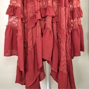 • Tiered ruffle hem, Sheer lace accents