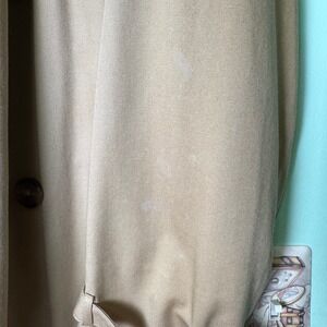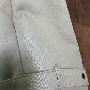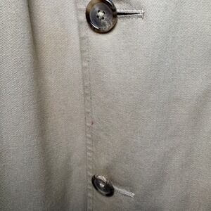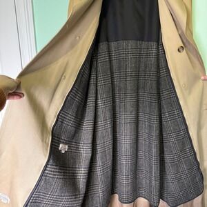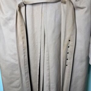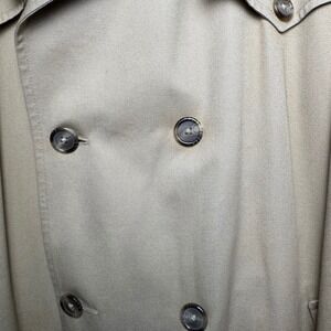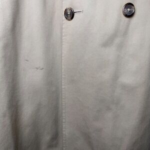 Classic beige double-breasted Christian Dior trench coat with adjustable cuffs, and a full-length design. Well-made vintage piece with a timeless look. Coat shows some spots/imperfections and noticeable but not severe areas of fabric fading, all visible in the photos.
