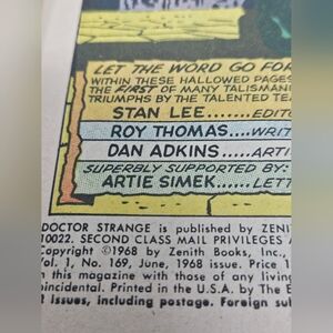 This is a single issue comic book, Marvel's Dr. Strange #169 from 1968. It features characters such as the Ancient One, Baron Mordo, and Doctor Strange, with artwork by Dan Adkins and writing by Stan Lee. Published by Marvel Comics in the Silver Age era, this key issue from the Avengers series is a first printing and 1st edition. It is in English and intended for a general audience, making it a collectible item for fans of superheroes and US comics.