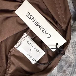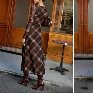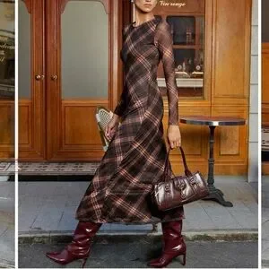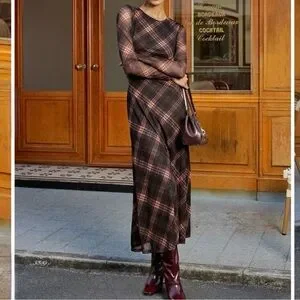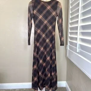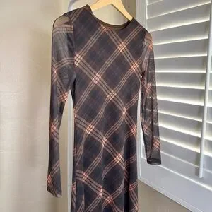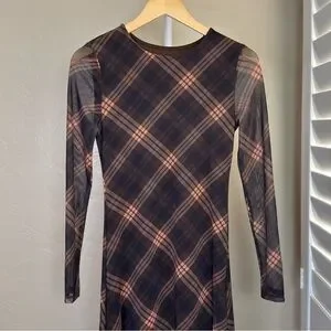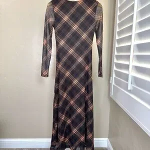 Commense Plaid Mesh Maxi Dress Brown Black Sheer Sleeves NWT