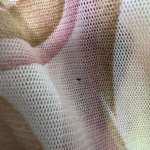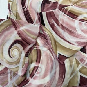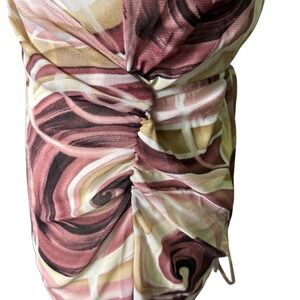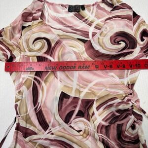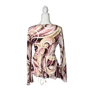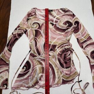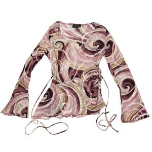 Y2K sheer mesh long sleeve top with abstract swirl print in pink, mauve, brown, and cream. Wrap-style V neckline with a fitted, flattering silhouette and flared cuffs. Lightweight, stretchy mesh fabric with major early 2000s / McBling / coquette vibes. Perfect for layering or wearing solo with low-rise denim or a mini skirt.