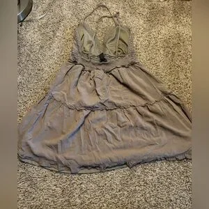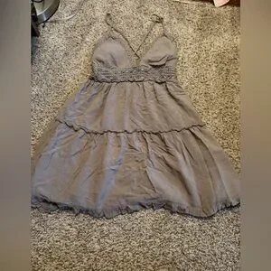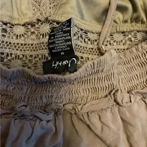 A Tan Boho dress with lace trim. Features a deep V-neck and tiered skirt. Perfect for Coachella or summer!