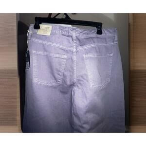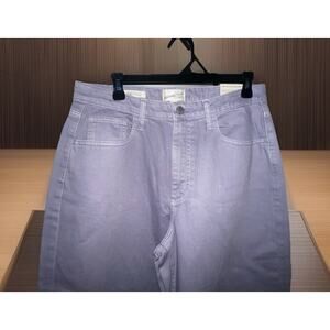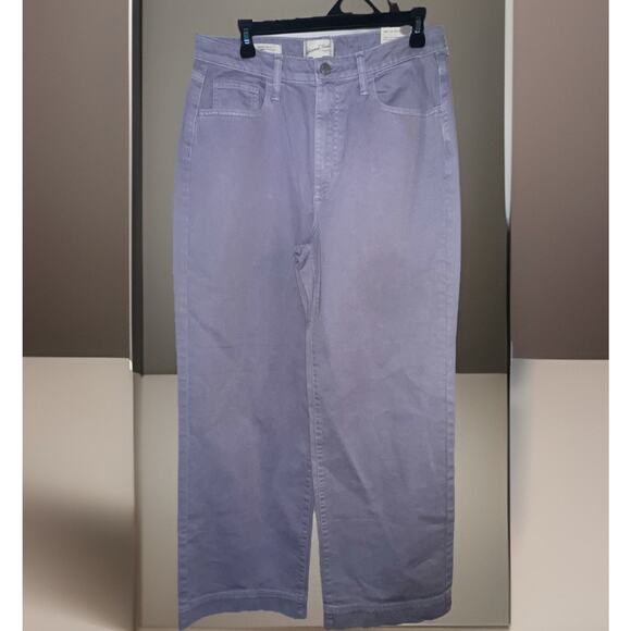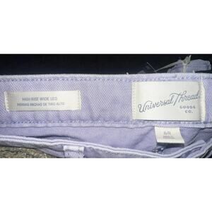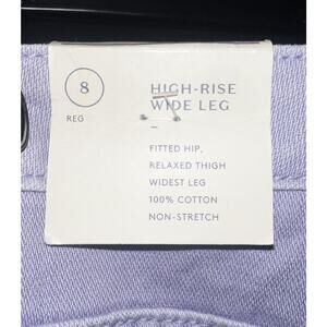 The product is a pair of Universal Thread high rise wide leg jeans in frosted lilac, size 8. These jeans feature a solid pattern and are made of denim fabric with a light wash. They have a wide-leg style, pockets, and a waist size of 32 inches. Perfect for women looking for a stylish and comfortable pair of jeans in a unique shade of purple.