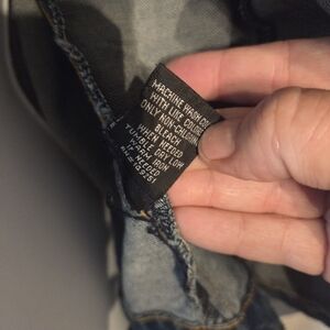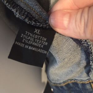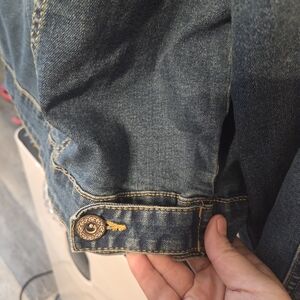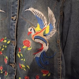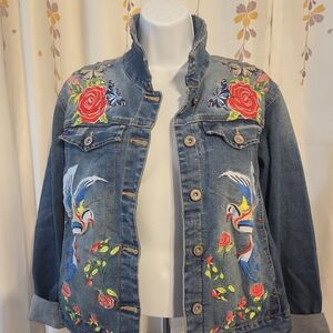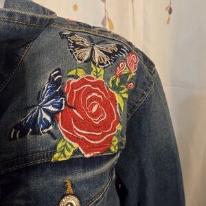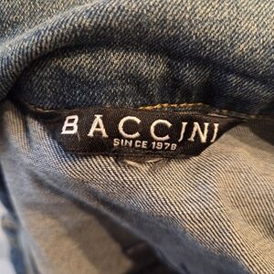 Chic Baccini denim jacket. Features intricate embroidery. Adds elegance to any look.