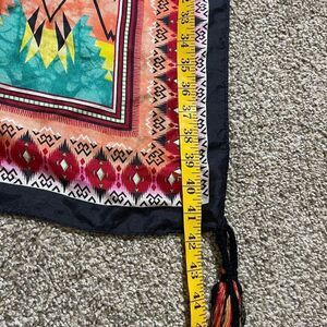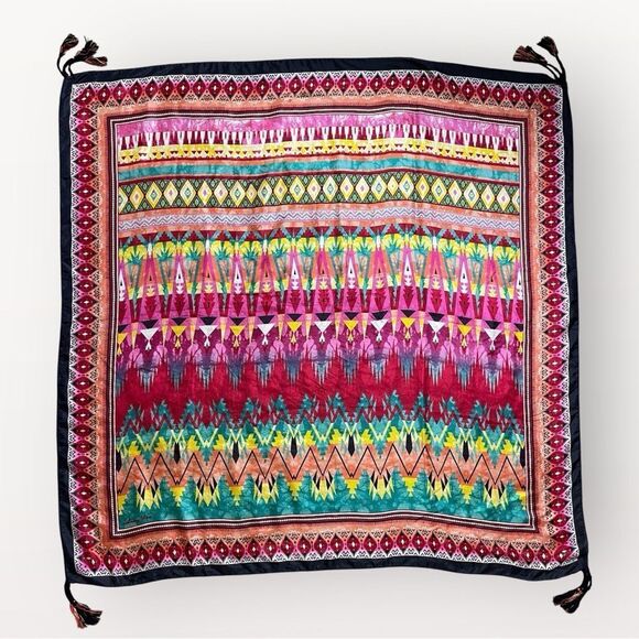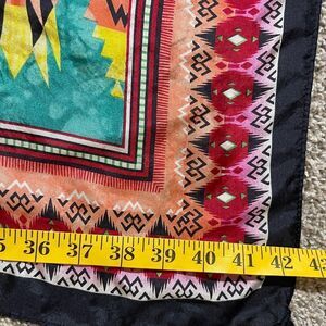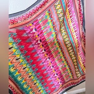 Vibrant scarf with intricate patterns. Features a mix of colors including pink, yellow, green, and blue. Perfect for adding a pop of color to any outfit.