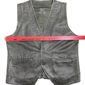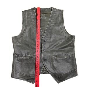 Koutons Originals sleeveless vest in a dark grey washed fabric. Features a V-neck, 3-button front, dual welt pockets, and clean stitched detailing. Perfect for layering with casual, western, biker, vintage, or streetwear outfits. Good Vintage condition-minor wear from age.