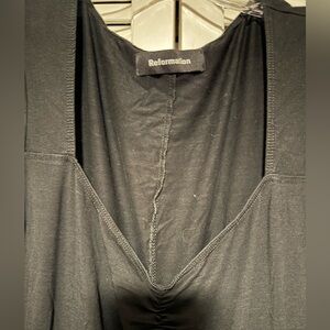 Chic black midi dress by Reformation. Features short sleeves and a flattering silhouette. Ideal for versatile styling.
