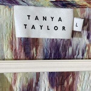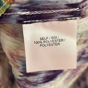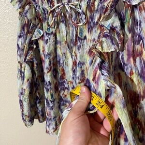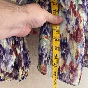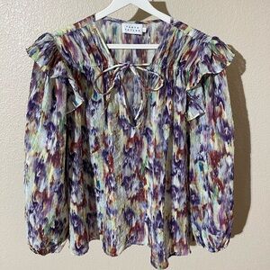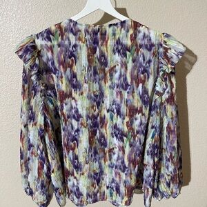 Chic blouse with a vibrant pattern. Features purple, cream, and brown tones. Stylish and versatile for any occasion.