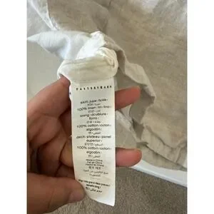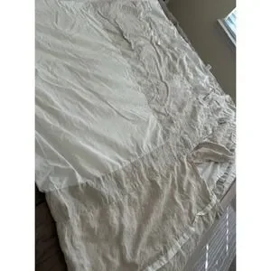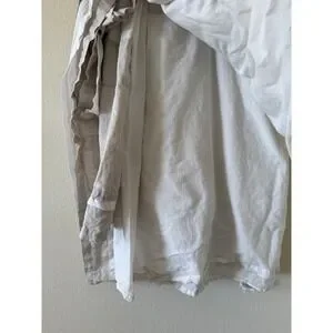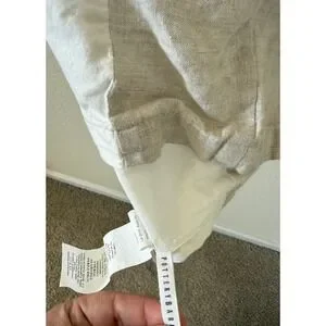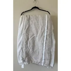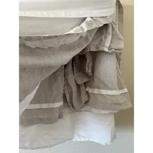 Excellent condition. Pottery Barn king size bed skirt crafted from high-quality 100% linen with a soft 100% cotton lining and deck. This elegant bedding accessory features a neutral flax and white color palette with a classic banded design, offering a clean and sophisticated look for any bedroom. The natural texture of the linen provides a relaxed yet refined aesthetic, while the sturdy cotton deck ensures it stays securely in place. Perfect for hiding under-bed storage and adding a finished touch to your bedding ensemble. 18in drop.