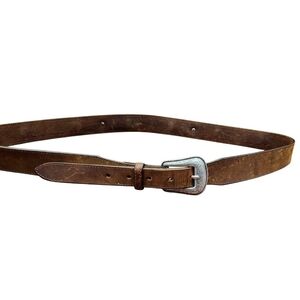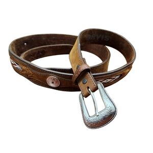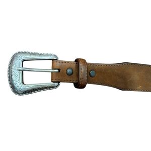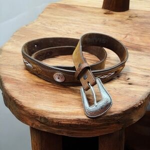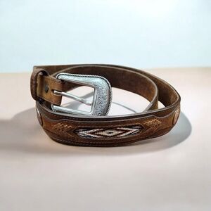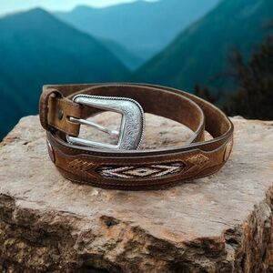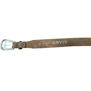 This is an Orvis men's leather belt in brown, size 46. It features a Western style with woven leather and buffalo nickel coin accents. The belt is handmade and has a buckle with a buffalo nickel coin detail. The material is leather and the hardware is nickel. It is a unique and stylish accessory for men's fashion.