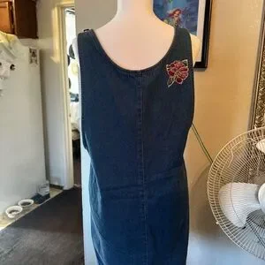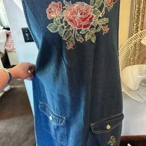 Chic denim dress with floral accents. Features practical front pockets. Sleeveless style.