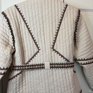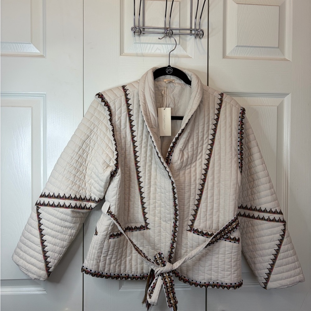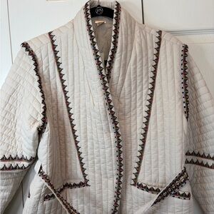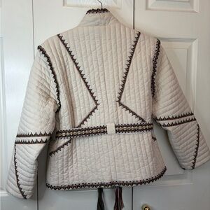 Stunning Magaschoni quilted jacket in a crisp cream cotton. This piece features intricate, colorful floral embroidery that gives it a high-end, artisanal feel—similar to styles found at Anthropologie.